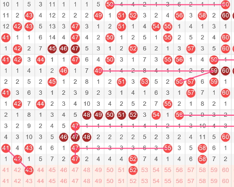 第三区间首先看一码43的三斜连有机会,然后防守一下41下落,再看52的重码有机会下落,58三重做防守,该区间可推荐的 选二搭配组合有43 49或者 43 44,第三区间胆码主看43 44 52