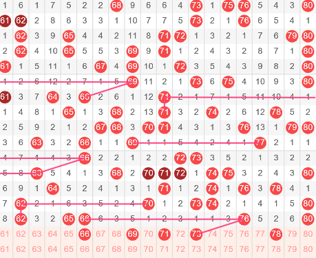 第四区间首先看一码66的重码有机会下落,然后防守62的 三重码出现,然后69 77二选一我选了69有机会下落,然后 71的 头顶三斜连有机会下落。73可做复制形态,尾部78可防守一下,该区间可推荐的选二搭配组合有69 71或者66 73.第四区间胆码主看66 69 71 73