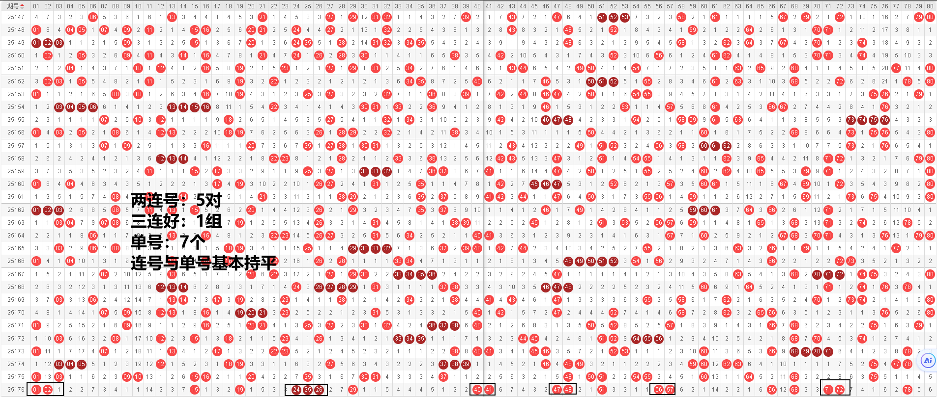 上期号码有五对两连号被开出,一组三连号被开出,七个单号被开出,整体上连号与单号组数基本相等。同时连号之间也多有单号隔开的现象。