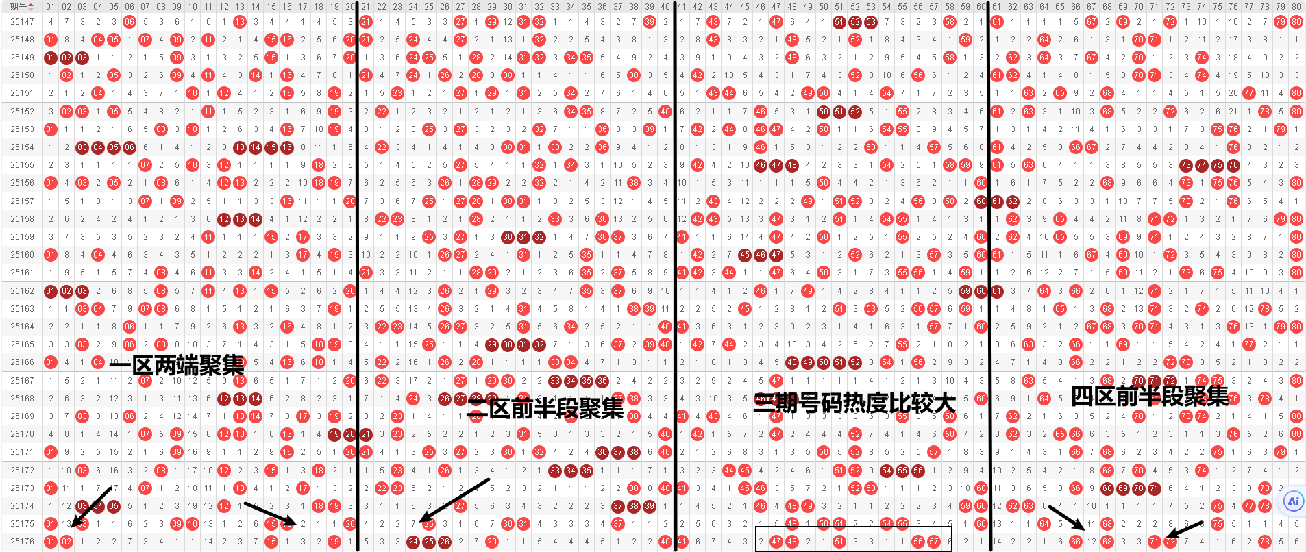 四区:四区号码前半段聚集的情况,本期推荐:67、70、76。