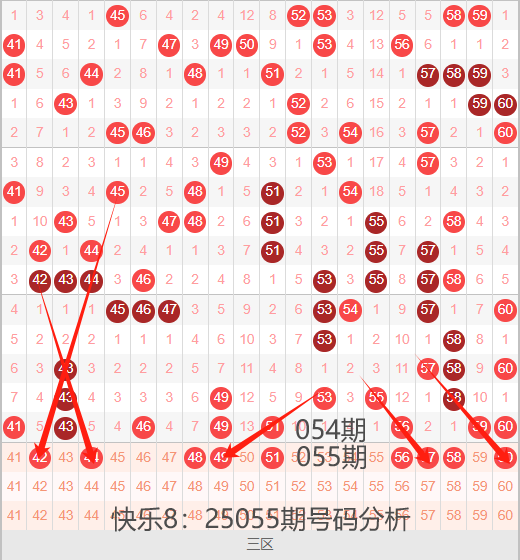 上期该区间开出号码:41 43 46 49 51 56 59 60,8个号码球,区间呈现热开,区间整体上目前是在热开的周期,号码出号近期也比较平均,分布相对与其他大区间来说很均衡,本期二区间个人预选号码:41 42 44 48 49 51 56 57 58 60,41号本期看重码的机会,42号和44号两码本期继续看一码的机会,交叉对称状态,48号是遗漏7期的号码,49号本期看重码的机会,均线三斜连落位点,51号和56号本期也是看重码的机会,57号是三斜连落位点,遗漏2期的号码,58号是遗漏间隔1期的对称状态,60号本期也是看重码的机会,四斜连落位,通过以上分析,三区间终选号码:41 44 48 49 56 58 60 。