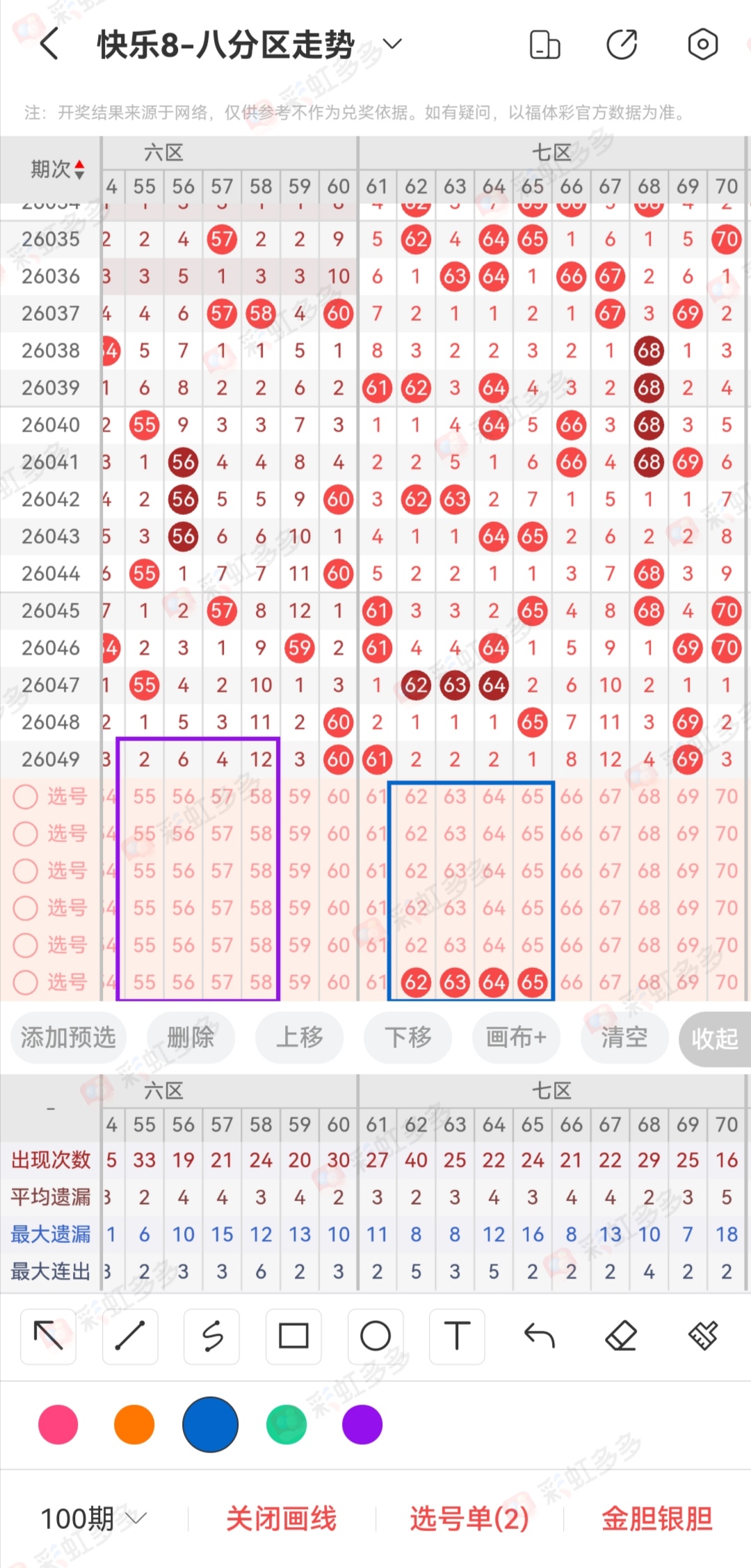 第二张图讲解的是一个范围,55-58这里存在遗漏特点,4期数据前后3期普遍会有1码,当然了要是选择不了那么可以直接做空。除非一种情况,这里例外在专属里面讲过。与之对应的就是62-65,这里的逻辑数据结论是稳定出1个,有可能是空区。只不过之前出现一个3连让我否定了自己。现在看来,这里还是相当稳定的,所以62-65以及55-58直接做空。宁可错过不能放过。