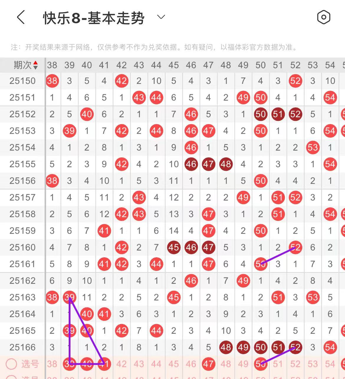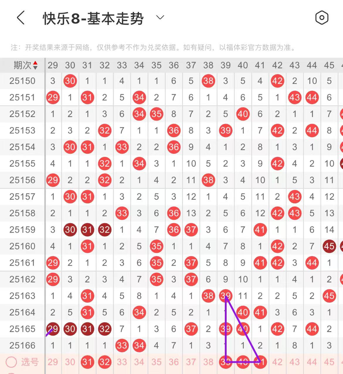 31-40区:本区间上期开出了两个号码,从号码走势图上看,该区出号个数有一定的规律性,本期注意出号个数有所增加,在选号上可考虑多做选择。本期有出号走势的号码有32号,做为边号开出的可能,防31.32同出,39.40.41号,形成一个三角走势形态。