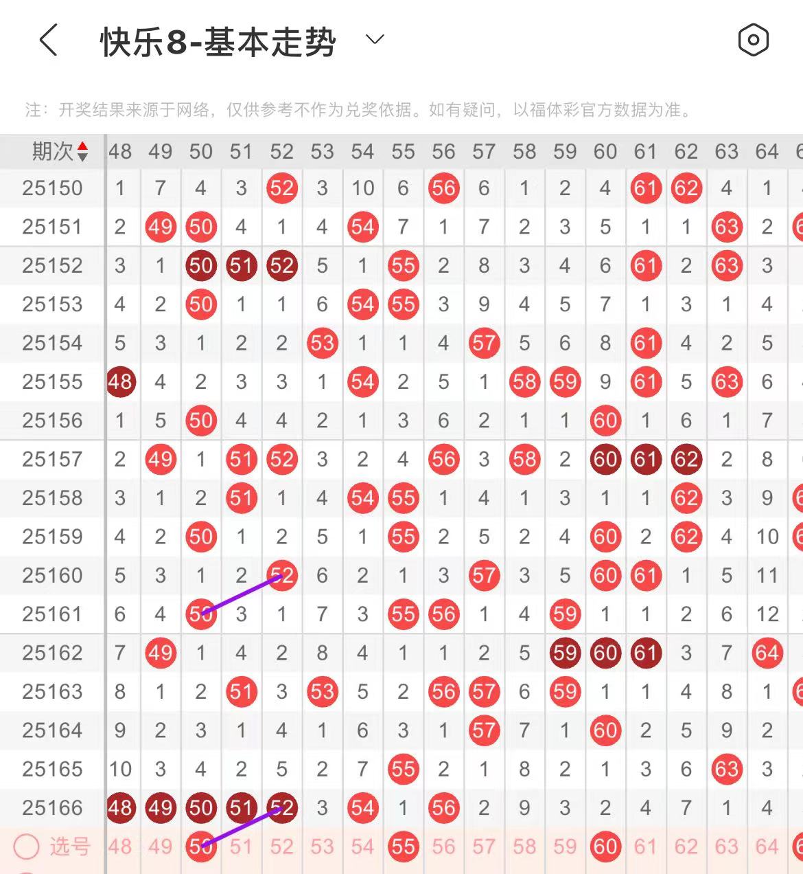 51-60区:本区间上期开出了四个号码,从号码走势图上看,本期重点关注后半区号码回补,出号个数应该在三个号码左右。本期有出号走势的号码有55号,形成一个梅花号走势形态,防55.60同出或者59.60同出的可能。