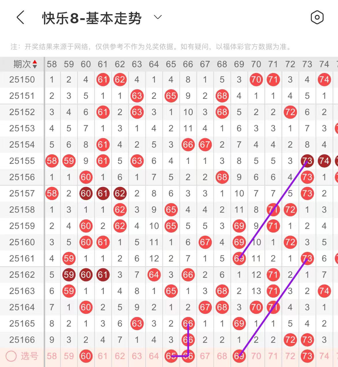 61-70区:本区间上期开出了一个号码,从号码走势图上看,该区现属于温热区,上期只出一个号码,本期注意出号个数所增加,重点关注后半区号码回补。本期有出号走势的号码有65.66号,形成一个L字走势形态,69号,斜连出号走势。