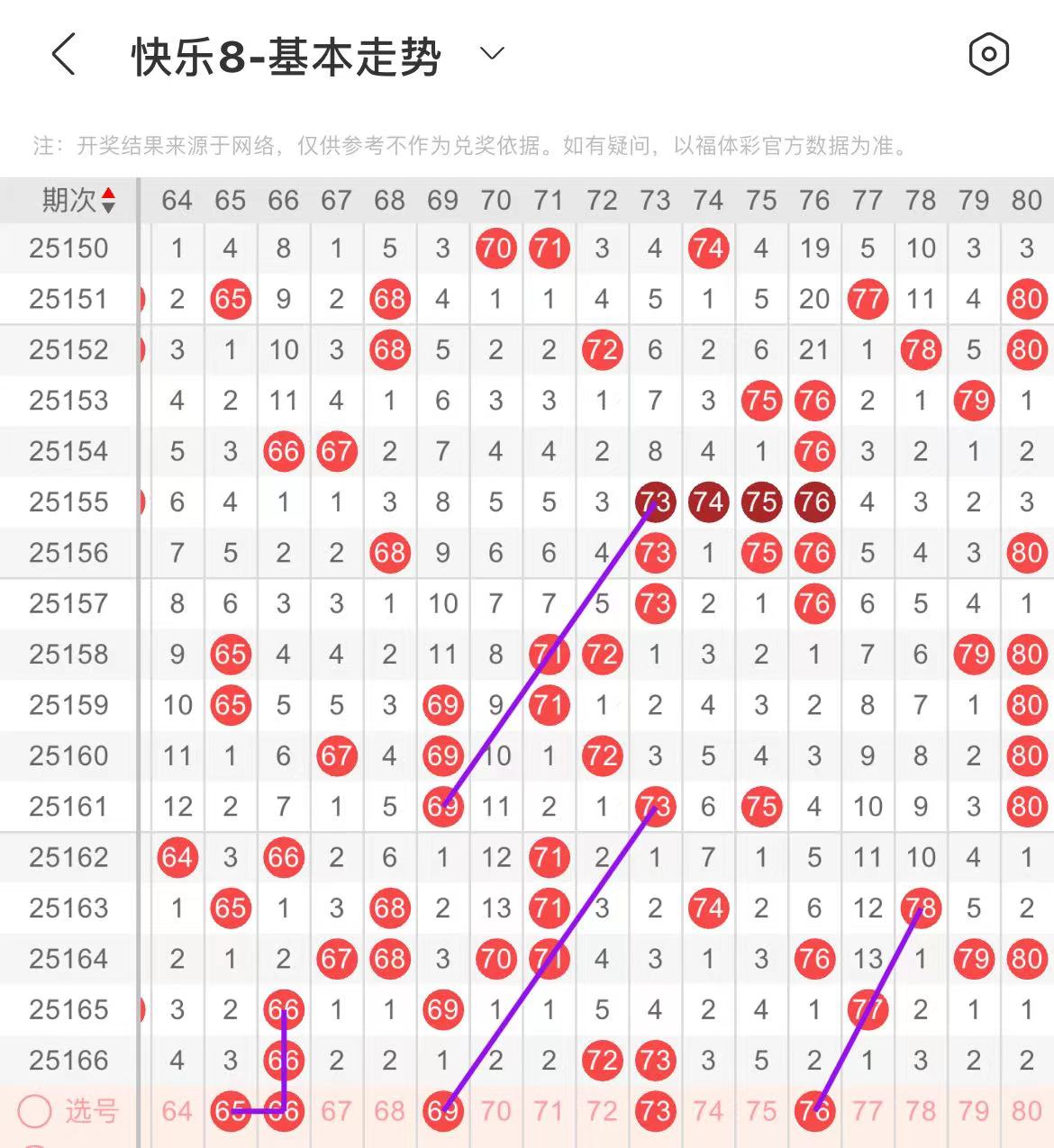 71-80区:本区间上期开出了两个号码,从号码走势图上看,该区现属于温号区,出号个数变化不是很大,应该还能保持在两个号码。本期有出号走势的号码有76号,斜连出号走势,防73.76同出的可能。