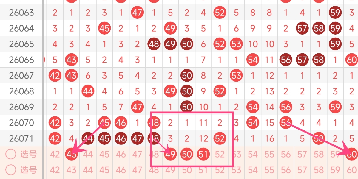 连号集中,沿热区拓展选号,昨日三区共开出8个号码,是昨日出号最多的区间,其中44-48形成五连号,密集度非常高。从历史数据看,三区每次出现超过4个的连号组合后,后续1-2期往往会延续“小范围集中出号”的特征,很少立刻分散到整个区间。 今日选号可以沿着上期的热区向外拓展:43、49作为42和48的相邻号,属于热区延伸的高频落点;同时可以关注50-55区间的号码,比如50、51,都是和上期热号距离适中的备选;如果想增加跨度,60也可以作为补充选择。三区整体建议选号4-6个,尽量保留1-2个连号组合,适配区间的出号规律,命中概率会更可观。而且还需注意其他已经连续多期漏出的号码,本期有几率回补。综合考虑,本期三区推荐关注号码:43、49、50、51、60。