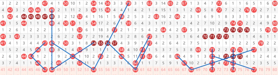 本期推荐重点:金胆47,银胆48,锦上添花胆54。 四胆全拖:47-48-54-08,加四码选五复式68-71-74-77。