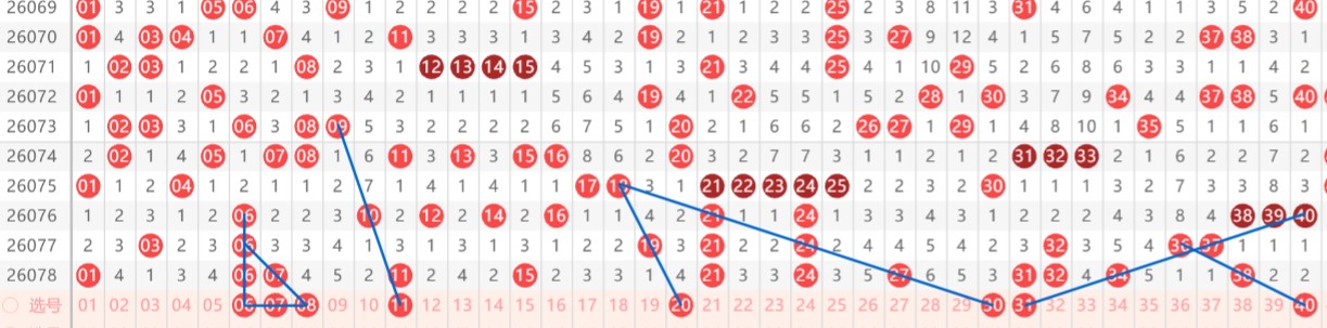 【第一区间1-40】上期开出12个号码。本期分析推荐:06-07-08-11-20-30-31-40八个号码。近30个开奖周期内,一小区间开出至少三连及以上号码7期,本期仍然看好此号码段回补三连及以上号码,故推荐06-07-08出号趋势;11为斜连号,在上期1尾多出的形态下,本期看11重出;20斜连三期,与11形成首尾号码出号形态;30-31均为同路号码的对子,考虑同出状态;40斜连号码,考虑0尾连号趋势。区间推荐重点号码:一小区间08-11-20,二小区间30-31。