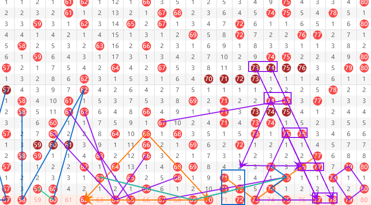 空位回补号码看好62-64-69-77-78,防2-3的开出机会