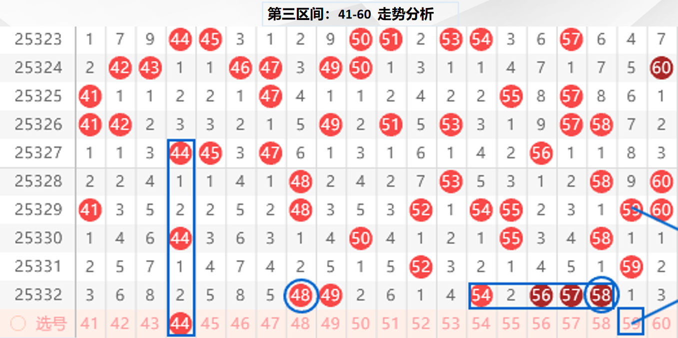 三区分析:【41-60】(走势图标注号码非小黄车大底,请谨慎参考,具体思路将在直播间分享讨论)