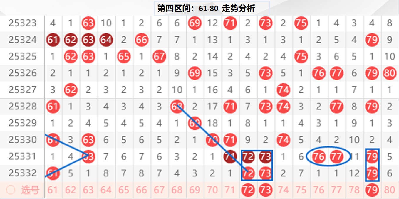 四区分析:【61-80】(走势图标注号码非小黄车大底,请谨慎参考,具体思路将在直播间分享讨论)