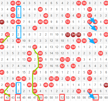 58:值得关注的是58,已经8期未出,看历史数据,57开出三期内,必有58,前几期57坐重号,上期57又开,本期重点关注58。