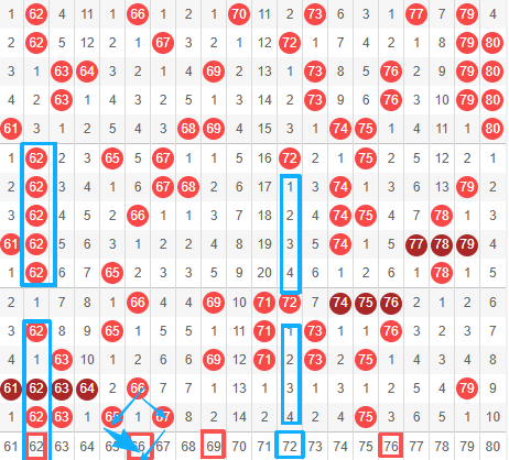 首先我们看下上期数据,和值为741。  奇偶比例为:13:7。   出了一组双连号,62+63。出了一组三连号,15+16+17。 直连重号出了4个,分别是26,47,62,63,均为两连重号。未出现断层区域。我们把 01-40划分为前区,41-80划分为后区,则小号偏多,均为热号和温热号。