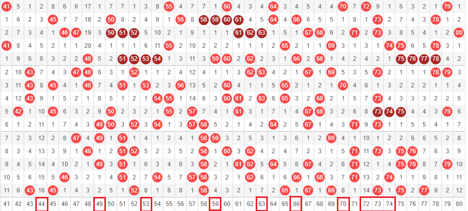 接下来我们一起看走势图,我们把01-40分为前区,41-80分为后区。