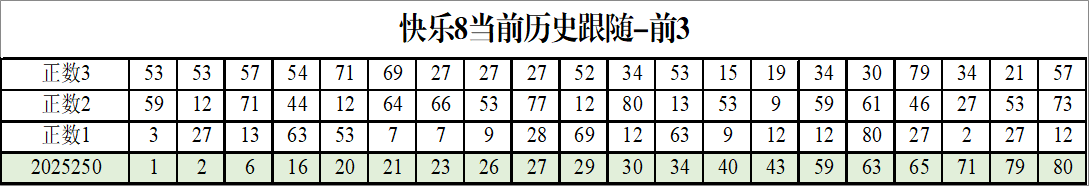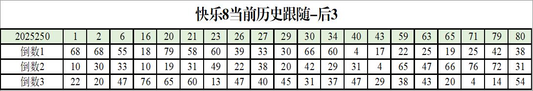 我感觉选热的同时,还要注意防冷条件开出,可以直接选取每个号码跟随出次前三的号码,也可以考虑把出次最后的三个数字加进去,不过这样可能号码太多,可以尝试。图上也能看出单独号码跟随的情况,我就不一一统计每个号码的出次了,我这里考虑提高概率,取每个号码历史跟随的前三号码和后三号码,根据2025250期的号码,我关注正数3和倒数3的号码号码为: