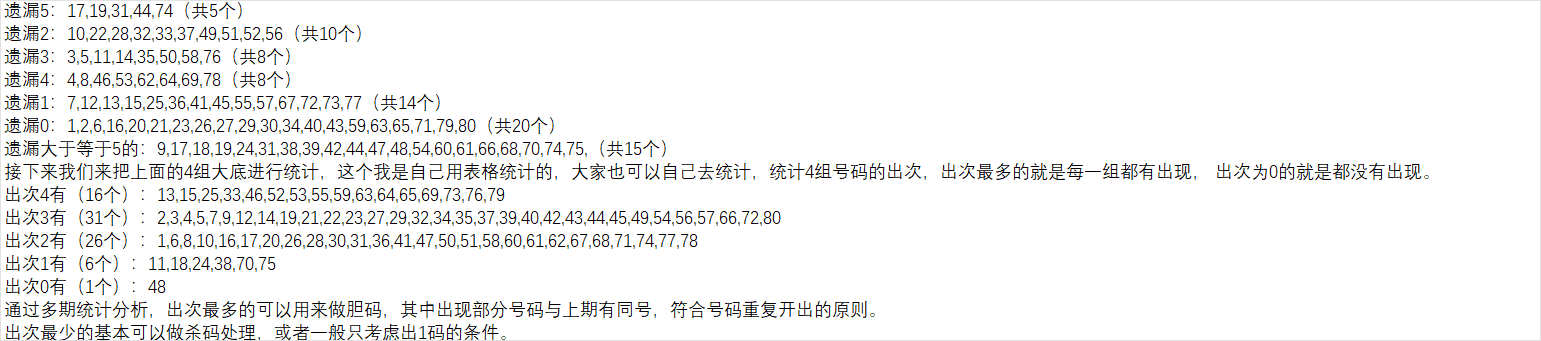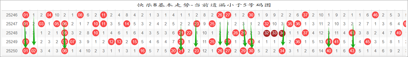 所以这个条件值得关注,从号码分布图上我们可以分析出,遗漏小于5期的号码有:
