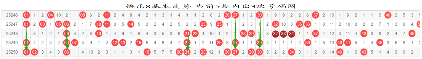 这个条件可以理解为追热号,主要是选取遗漏小于5期的号码来做大底,通过号码分布图我们也能看出,每期都有重复号,都有上期号码的相邻号,再仔细观察下面的部分分布图,2025250期,按照【号码(遗漏)】的方式统计出来是:1(0),2(4),6(0),16(5),20(7),21(0),23(2),........。可以看出遗漏小于5的号码比较常见,这就是一个大概率事件,我们就可以用这个梳理出一部分号码,用来作为我们交集的一组号码。