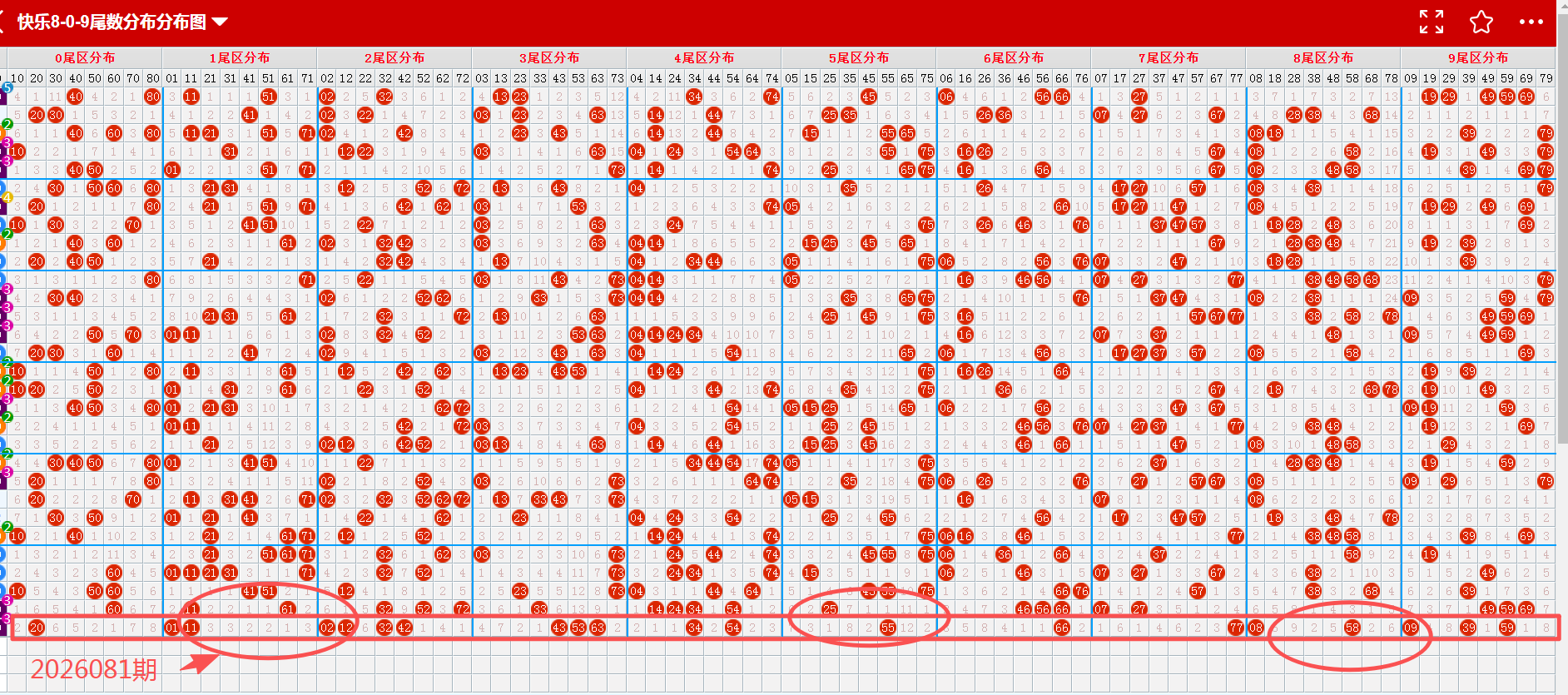 上图是快乐八2026081期的尾码走势图,从图中看0尾到9尾出号个数依次是:0尾号码区开出1个;1尾号码区开出2个;2尾号码区开出4个;3尾号码区开出3个;4尾号码区开出2个;5尾号码区开出1个;6尾号码区开出1个;7尾号码区开出1个;8尾号码区开出2个;9尾号码区开出3个;再看小尾号码(0尾-4尾)区有12码,大尾号码(5尾-9尾)有8码;数据比对统计后可以看到本期2尾出号数量最多,一共开出了4个中奖号码。本期没有尾区出现断区!由走势比对推断2026082期重点需要关注1、5、8尾区号码下号热度回补和落号数量增加的概率较大。