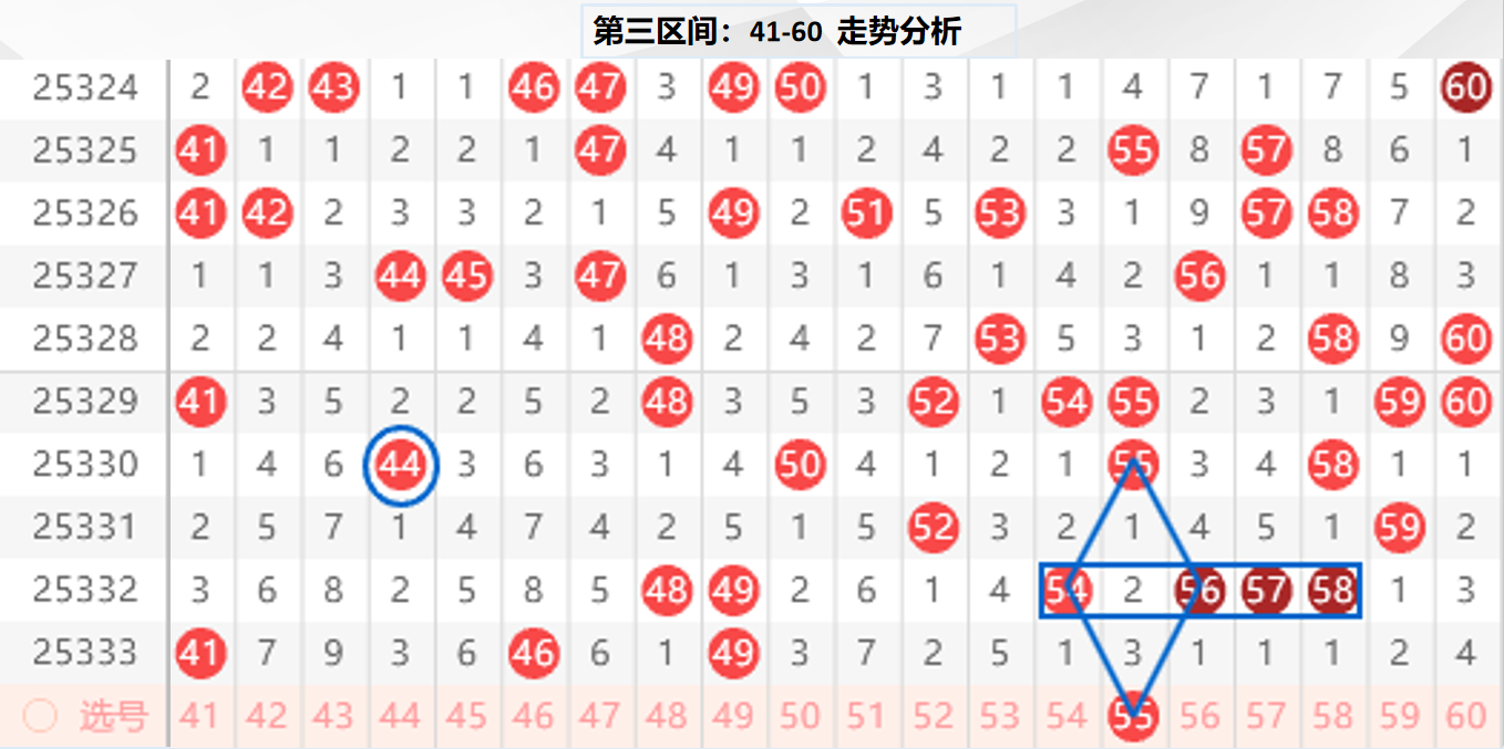 三区分析:【41-60】(走势图标注号码非小黄车大底,请谨慎参考,具体思路将在直播间分享讨论)