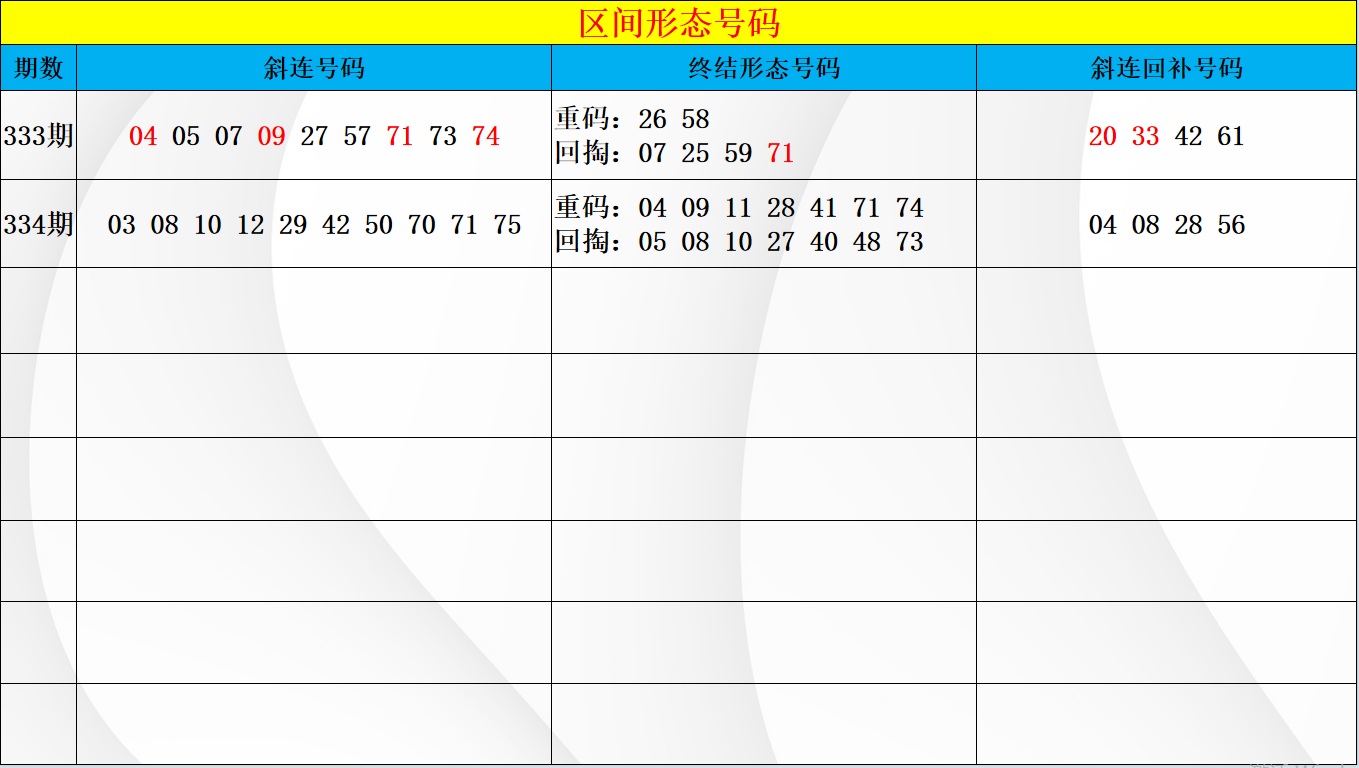 上期三区的开号在前区的出号中还是表现强势,区间在形态上继续保持开号的重点,且重码回补位置出现,以形态接力上考虑出号机会,本期还是要侧重41 46 49三码中的重码出号选择,尤其在46 49的同路组合开出后以近期的同路的开号模式上也要特别注意这里的回补机会,重码和分边中都有对应的形态点位出现,注意形态布局上这里的考虑重点。后区中的回补重点是以断头小周期结合三同路放空位置判断,在近期的一区二区做三同路放空的位置下方都是有对应号码的开出,其中分边中保持着不中断的开出,对应本期三区空位的回补中可判断在53 55 56 58四码中的考虑择一,小周期上优先选择在55 56 58的出号,温冷中防守在51 53的位置,尤其在三连号的放空做隔期回补中,这里可重点考虑择一的布局选择。