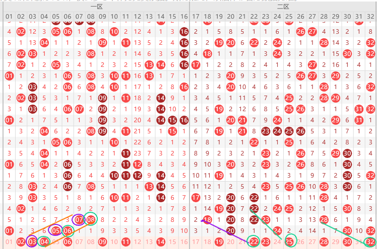 二区胆尾0尾2尾,2尾连出4期,0尾出8期本期接着跟,那么本期就是22 32  20 30要出二码,重号如果不断就是30其次32,边号19 21 23 25 29 31要出1-2码,近期二区趋势隔一期出一个冷号,本期冷号 21  27 31大概率要出一码,形态上22 25 32是斜连号上图已勾画,本期预判出隔一期号,本期重点关注四码22 23 18 30