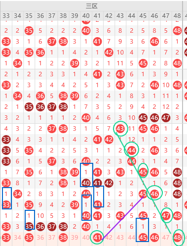 三区胆尾3尾8尾5尾,胆尾先关注热尾,那就是33 43 35 45 38 48要出2-3码,形态上41 48是斜连号上图已勾画,隔一期号连出多期上图已勾画,本期隔一期号41 45 48出一码,5尾8尾最热,那就是45 48出一码,近期隔一期号每期出2-3码,那么本期45 48有同出概率,本期关注五码33 35 45 43 48 防34 46