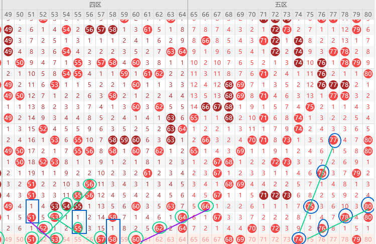 四区看好4尾6尾8尾,本期边号51 53 54 56 62 63要出号,形态上51 53 57 60是斜连号上图已勾画,重号52 55 62 64要出一码,如果64不出三直落,52 64二出一,就是52出重号,4尾连出3期,本期54 64要出一码,本期应该有隔一期号看好58,本期关注五码52 54  56 58  64防63