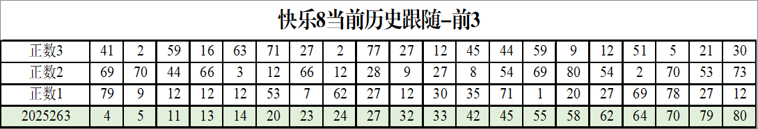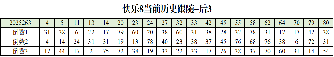 我感觉选热的同时,还要注意防冷条件开出,可以直接选取每个号码跟随出次前三的号码,也可以考虑把出次最后的三个数字加进去,不过这样可能号码太多,可以尝试。图上也能看出单独号码跟随的情况,我就不一一统计每个号码的出次了,我这里考虑提高概率,取每个号码历史跟随的前三号码和后三号码,根据2025263期的号码,我关注正数3和倒数3的号码号码为:
