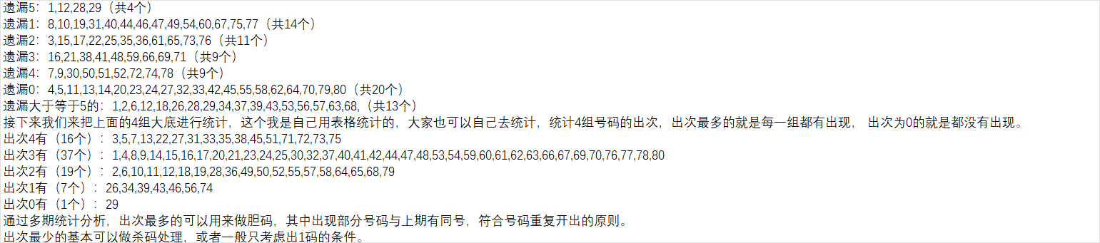 如果把对数和补数合起来有40个号码,中间可能还会产生一下重复数,通过近几期的统计分析,以上期数据进行补数对数计算推算下一期的概率不高。为提高概率,我主要是用前两期的数据来进行对数补数推算,然后再组成一个集合,作为我的第四组大底号码。