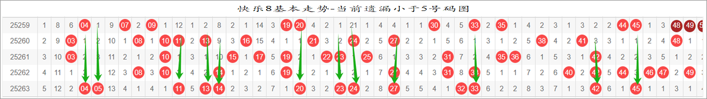 所以这个条件值得关注,从号码分布图上我们可以分析出,遗漏小于5期的号码有: