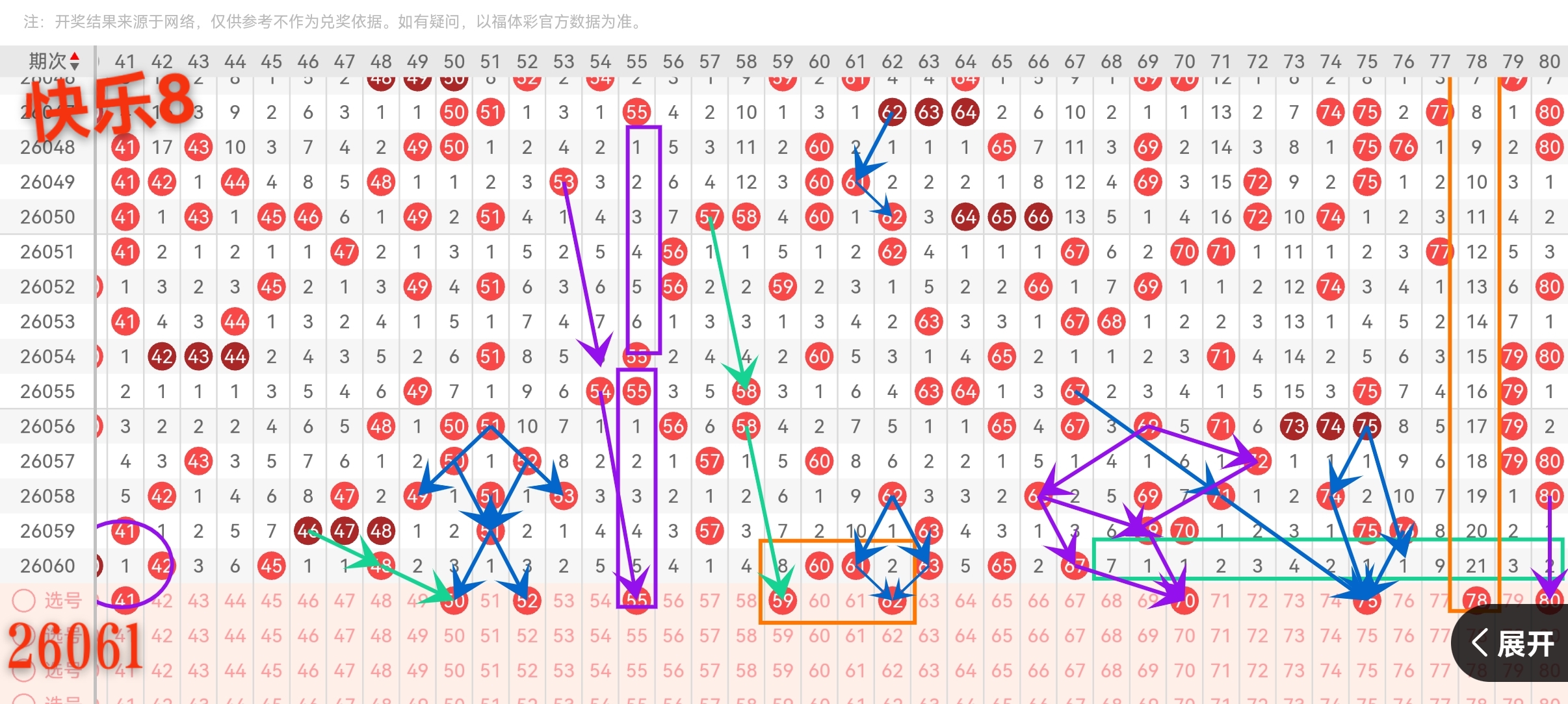 80:80是四区最大的数,也是整个快乐8的龙头老大。最大号永远有它的吸引力,时不时就会开一次来证明存在感。尤其当四区整体不算太冷的时候,80完全有可能压轴出场。