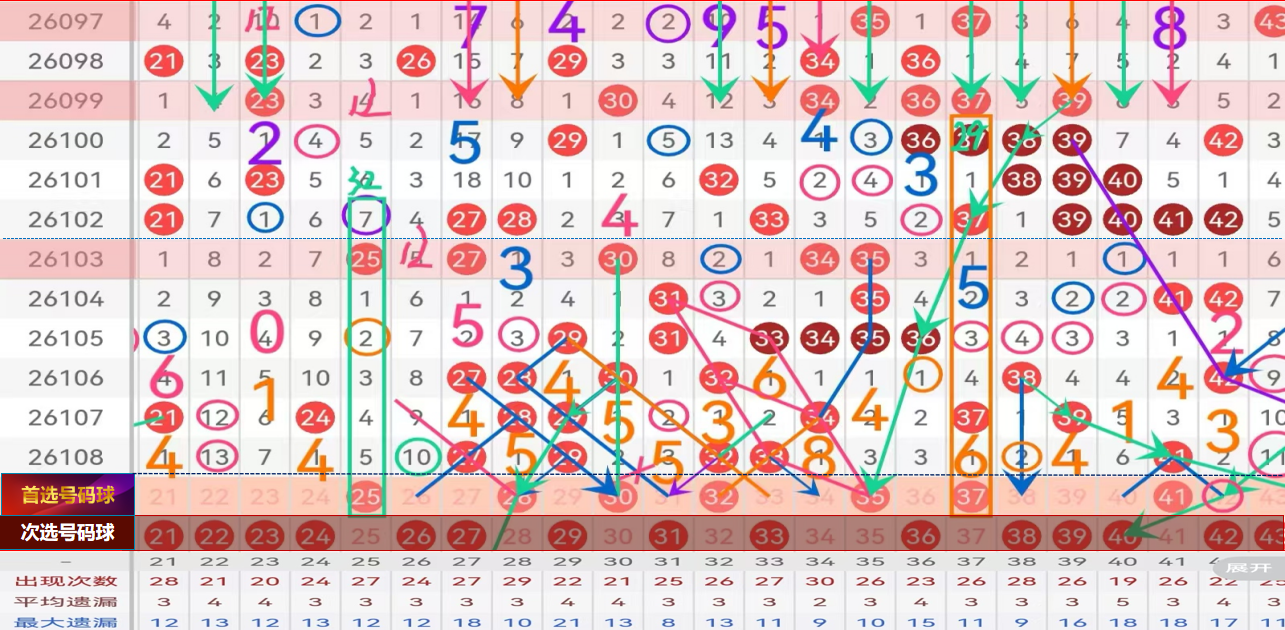 二区间推荐主做号码:25 28 30 32 35 37 防守号码:34;