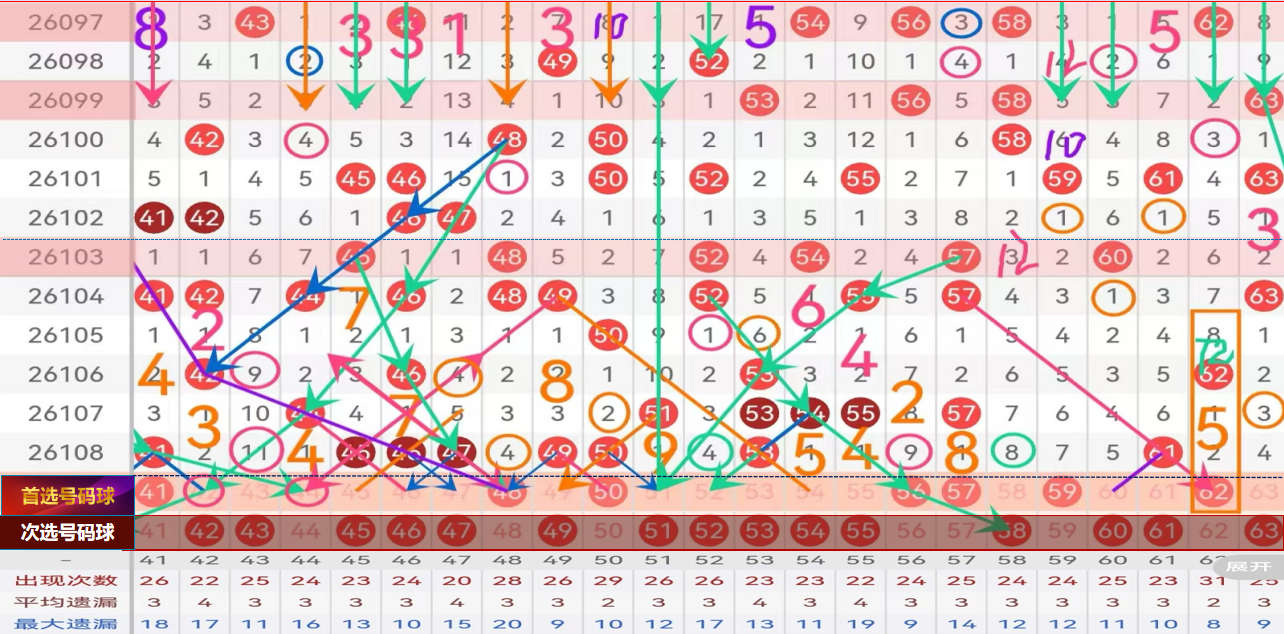 四区间上期开出了5个号码,均值开出;孤码61这里建议主看分边码62,遗漏属性复制码,第六次走遗漏2点位,小数据码,可做防;双重66的分边65 67本期可奇数连复式码防守,二择一主做推荐67顺势码,也可国内组合拿号;7字头本期推荐一码75的斜连回首掏,第七次走遗漏1点位;尾部80本期可重点关注走重热态开出;