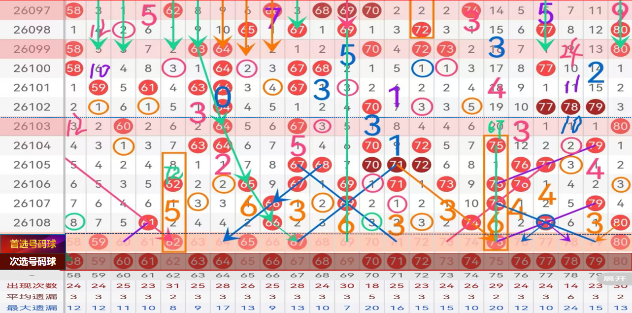 四区 间给到主做号码球:62 65 67 75 80 防守号码:69 73;