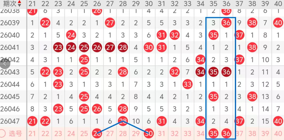 第二区间的走势分析:第二区间上期开出了七个号码球,主要的落号点位在二区间的前后半区,走出了三奇四偶的形态走势,上期二区间的前半区落下了三个号码球,后半区落下了四个号码球,整个二区间处于走热的趋势,根据二区间的走势规律,今天的二区间我们主看二区间前后半区中间位置冷热码的回补,前半区主看26 30这两个号码球的落位,落下一码的机会很大,重点关注30的回补,再看后半区热码35 36的回补,注意30 35的组合以及26 36同尾的组合,这四个号球建议大家打个四码复三,或者打个四码复二比较稳妥,参考为主!