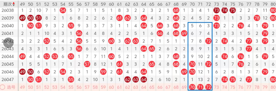 第四区间的走势分析:第四区间上期开出了七个号码球,主要的落号点位在四区间的前后半区,走出了三奇四偶的形态走势,上期四区间的前半区落下了三个号码球,后半区落下了四个号码球,整个四区间处于走热的趋势,根据四区间的走势规律,今天的四区间我们主看四区间后半区龙头位置冷码的回补,主看70 71 72这三个号码球的落位,这里大家可以重点关注一下,注意它们两两组合的落位,这三个号球建议大家打个三胆拖,或者打个三码复二比较稳妥,参考为主!