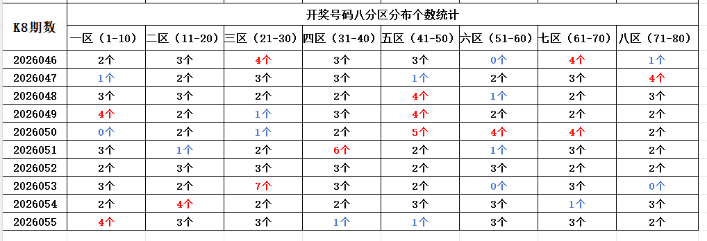 首先看上期回顾,“快乐8”第26055期开奖结果:3.4.8.10.12.16.19.22.24.26.31.49.54.55.58.63.64.67.75.79;通过分析开奖号码,分享第一个数据分析:统计开奖号码的八分区冷热走势,判断出号规律。以近10期开奖号码的八分区统计数据为例: