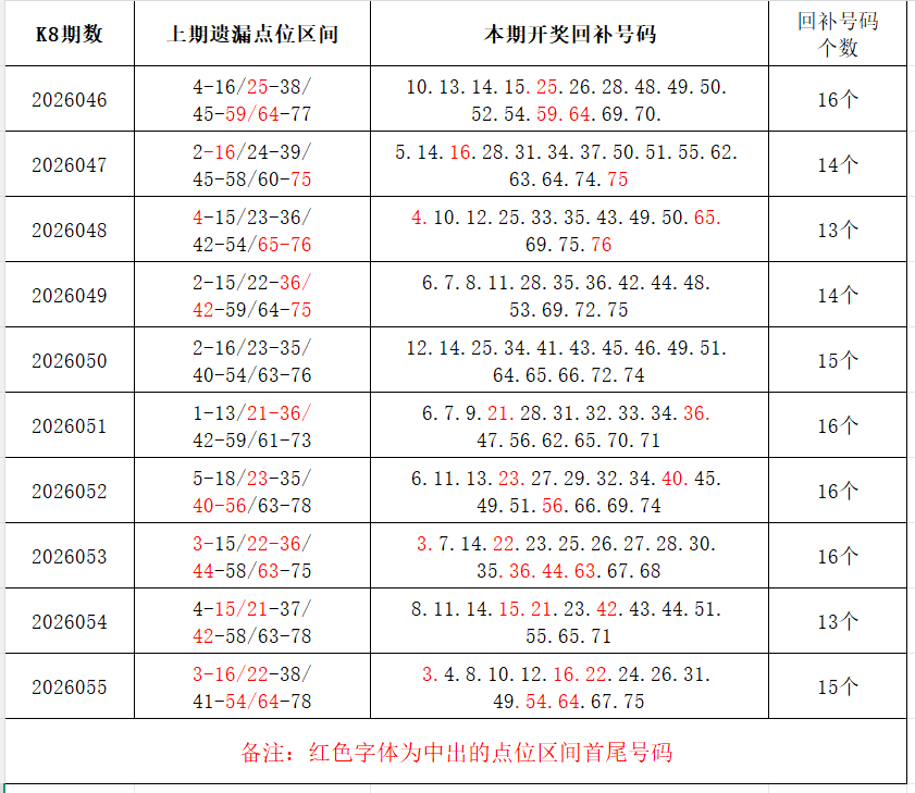 如图,上期的遗漏号码在下期开出10个左右,即为回补号码。定准点位区间首尾号码是关键!以上期2026055期为例,定位4个遗漏区间,围中15码!结合上期开奖号码,以跨度值大于或等于7为依据,本期关注2个遗漏区间:31-49/67-75;重点关注遗漏区间:5-18/23-36/44-59/65-76。点位区间号码和大底号码请勿混淆,个人分析,仅供参考。