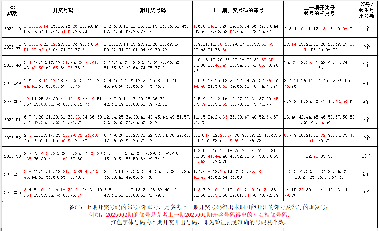 如图,红色字体是上期邻号、邻重号在下期开出,每期开出10个左右。上期邻号开出8个,邻重号开出2个。本期参考邻号:2.5.7.13.15.17.18.20.21.27.30.32.48.50.53.56.57.59.62.65.66.68.74.76.78.80;邻重号:3.4.9.11.23.25.54.55.63.64;个人分析,仅供参考。