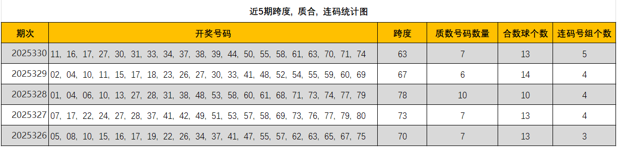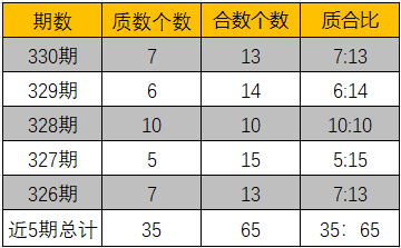 本期观点:合数在近五期占据显著优势(65个)。尽管328期质数强势反弹,但随后两期再次回落,显示合数主导的格局依然稳固。本期预计质数个数将维持在中低位,合数继续占优。