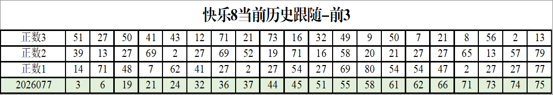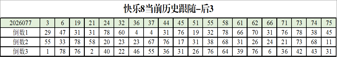 我感觉选热的同时,还要注意防冷条件开出,可以直接选取每个号码跟随出次前三的号码,也可以考虑把出次最后的三个数字加进去,不过这样可能号码太多,可以尝试。图上也能看出单独号码跟随的情况,我就不一一统计每个号码的出次了,我这里考虑提高概率,取每个号码历史跟随的前三号码和后三号码,根据2026077期的号码,我关注正数3和倒数3的号码号码为: