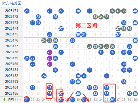 上期二区开出7个奖号(25.27.30.33.35.39.40)上期回顾二区开出7个奖号二区间在上期落位同比前期的话呈现了一个递增的落位趋势,先来看本期号码21整体活跃度较温冷,在近 30 期里有一定的间歇性出现,不是每期都开,整体走势也是较温冷的。号码27近期热度一般,间隔性也不是很稳定,说明其在当前阶段活跃度较温冷注意防守。号码31近期活跃度较稳定,有一定的间歇性近期整体走势相对平稳没有特别明显的冷热趋势变化,号码36近30期内活跃度较一般,没有明显的连续出现形态走势,整体表现比较动荡不是很稳定。