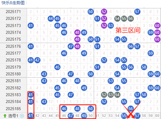 三区间开出了4个奖号(46.48.50.56)上期回顾三区开出4个奖号上期的三区间的奖号数量呈现一个递减的形态,4头回补了2个号码,本期先来看号码41近期出现频率相对来说比较稳定。偶尔有时间隔期数也是很长,说明其在近期的开奖中较稳定,号码47在近 30 期内出现次数相对较稳定的号码,近期的活跃度也是较稳定。号码55有一定的间歇性,通常间隔5-3期会出现一次,没有明显的连续出现态势,走势相对较热,在整个第三区间的表现本期还是可以防守的。号码57走势相对近期较稳定,近期没有连续间隔落号的情况,活跃度近期处于较稳定状态注意防守。