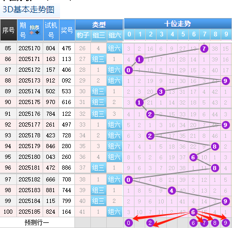 上期3D十位开出的奖号是6号,上期在十位上6号球这个号码在上期是三跨度的落位点,本期来看0号和2号球在十位上要注意这两个号码是有机会继续顺着上期的6号球走出两个常搭配落位趋势这里的两码注意防守一码就好了,然后7号球还是一个大号码这里也是一个冷号常搭配的落位点,再来看9号球是一个折返的落位点要注意防守还是很好看的,6号球这里的号码要防守能走出重码的概率注意研判。