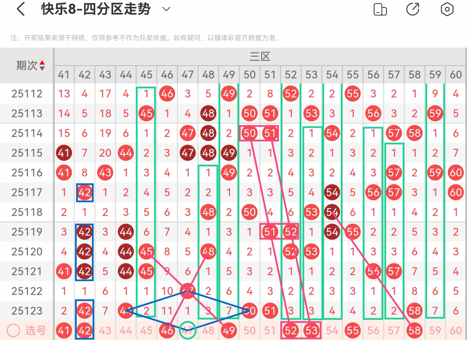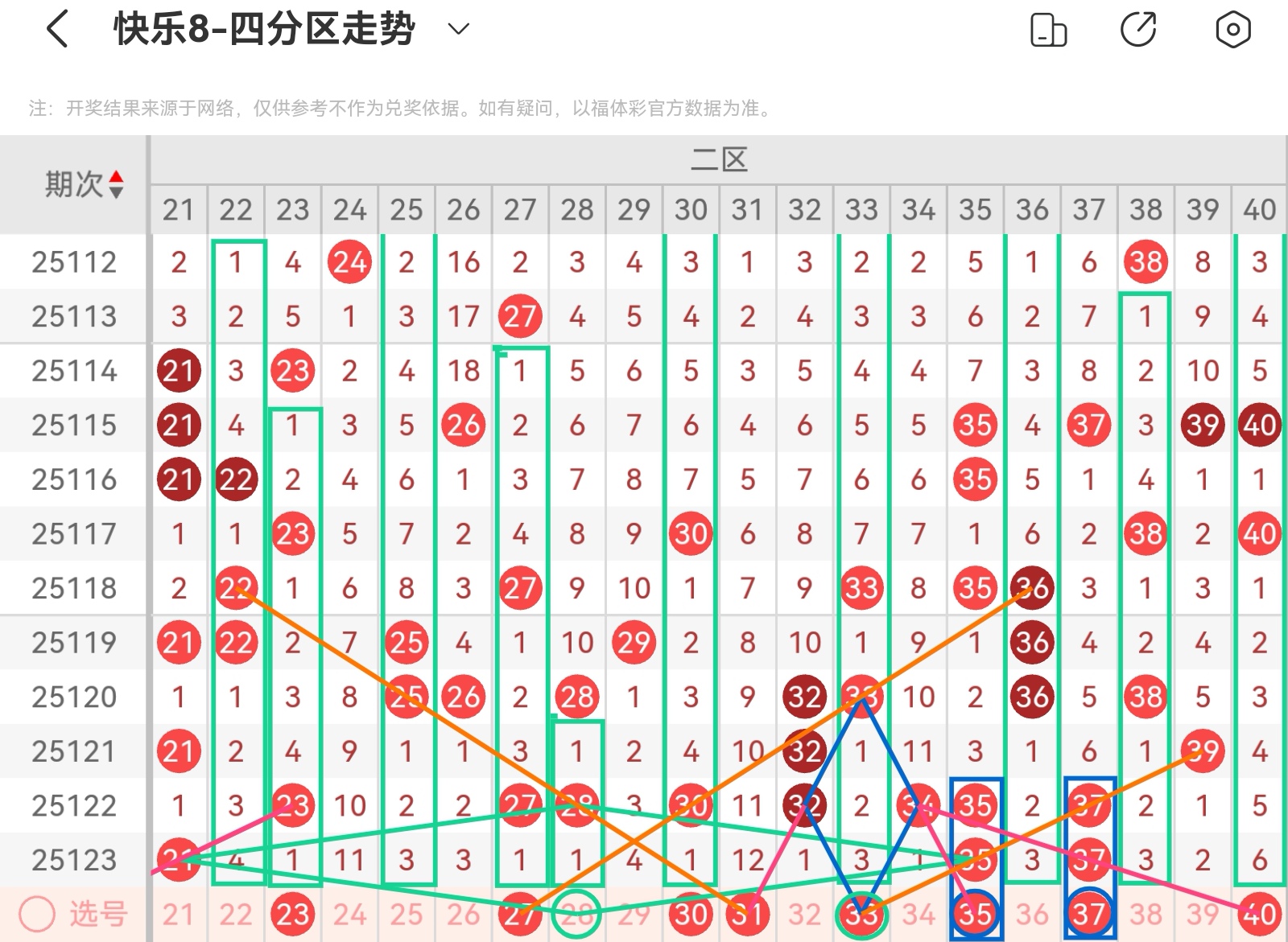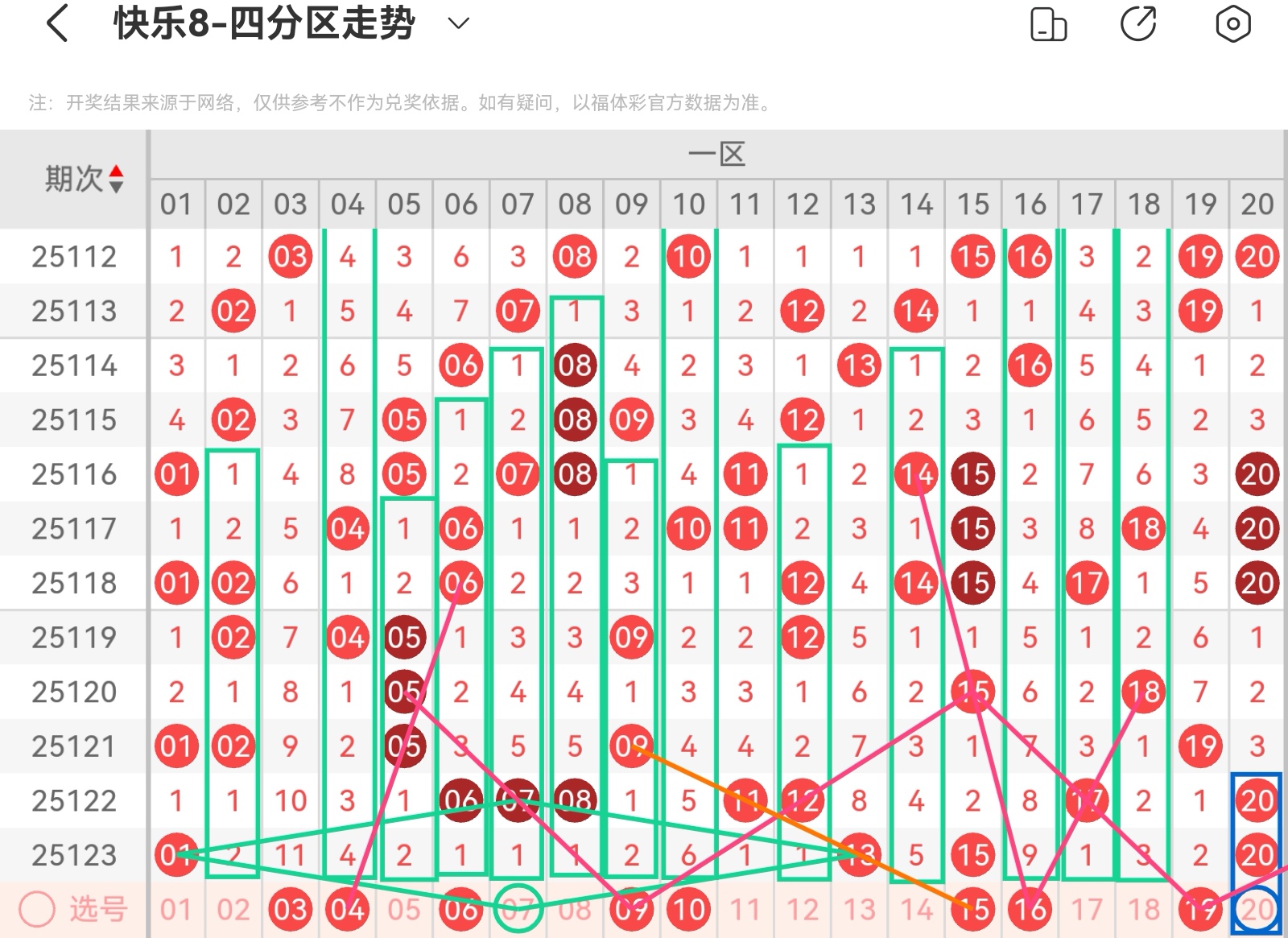 大家好,我是甜丝丝的坏事,主要以快乐八的形态走势、空位走势、遗漏走势以及斜连走势相结合的方法,用公认的四分区走势来进行预测分析,希望能让你有所收获。