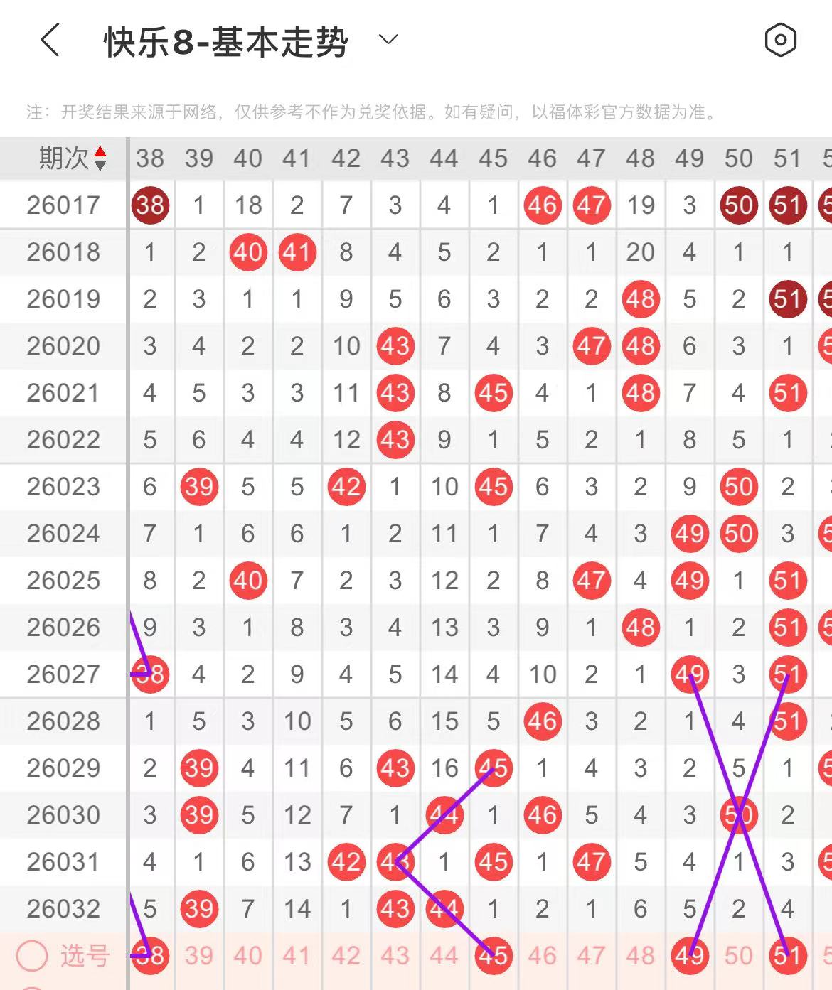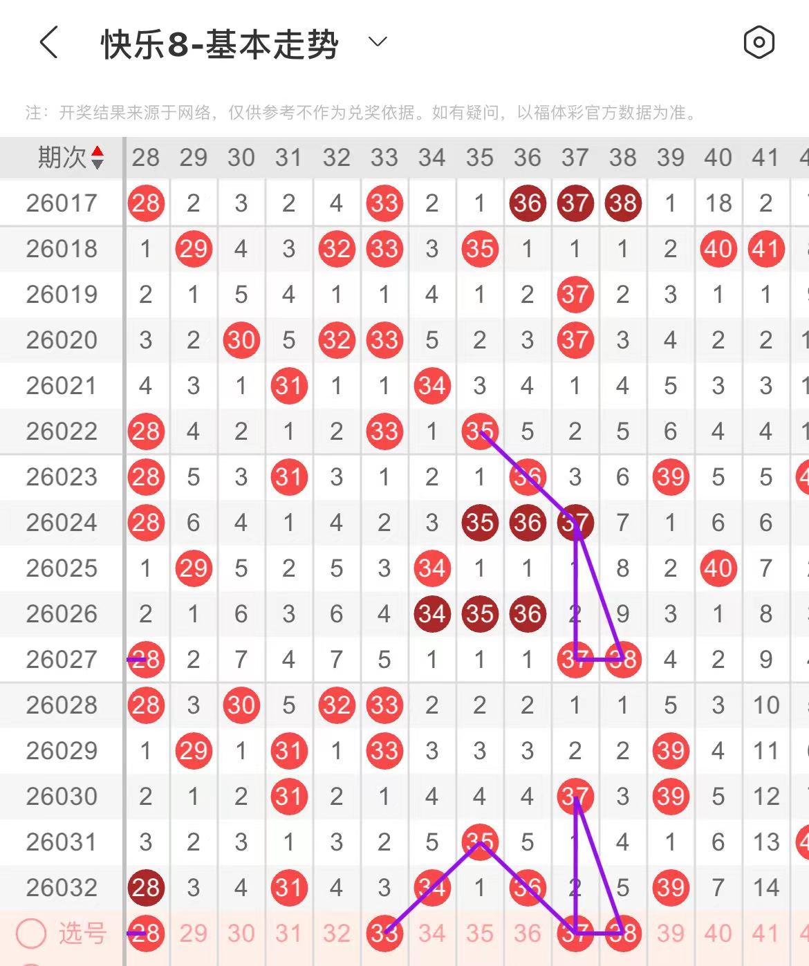 31-40区:本区间上期开出了四个号码,从号码走势图上看,该区现属于温热区,本期出号个数应该还能保持在三个号码左右,重点关注后半区号码开出,有出号走势的号码有33号,斜连出号走势,37.38号,同出,形成一个三角走势形态。