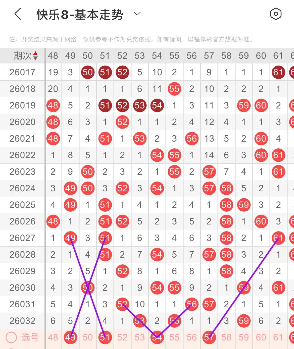 51-60区:本区间上期开出了三个号码,从号码走势图上看,该区现属于温热区,出号个数在三个号码左右,有出号走势的号码有51号,斜连出号走势,54号,双线斜连出号走势,防54.57同出或者51.54同出的可能。