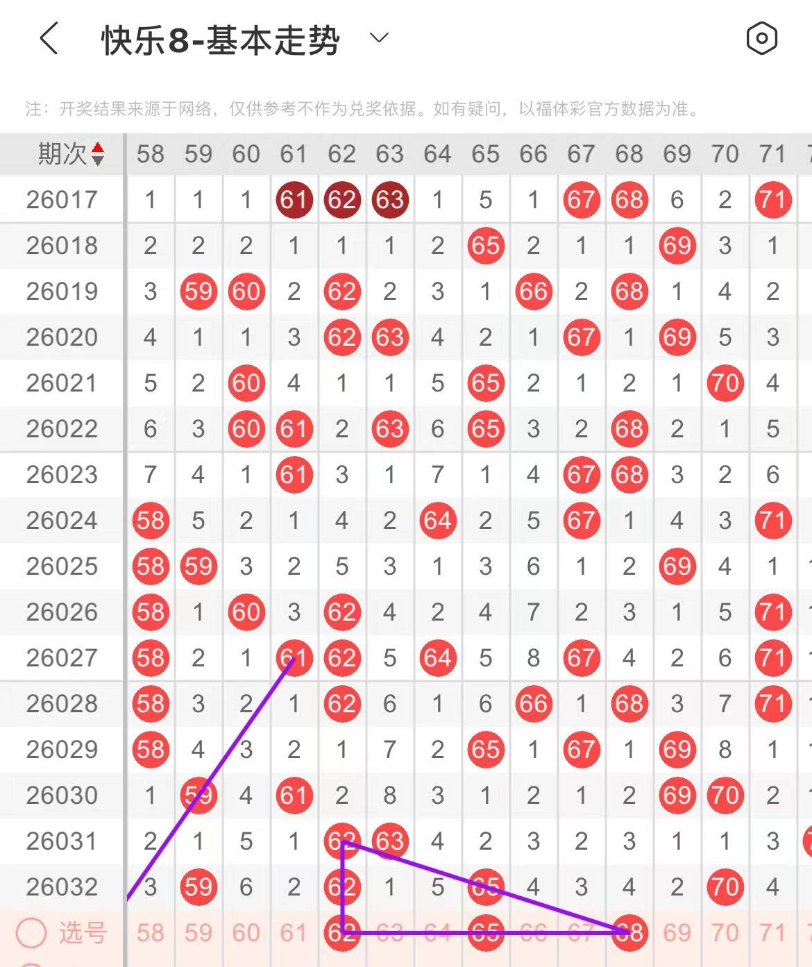61-70区:本区间上期开出了三个号码,从号码走势图上看,本期关注同路号码开出,出号个数在三个号码或者以上,在选号上可考虑多做选择,有出号走势的号码有62.65.68号,同出,形成一个三角走势形态。