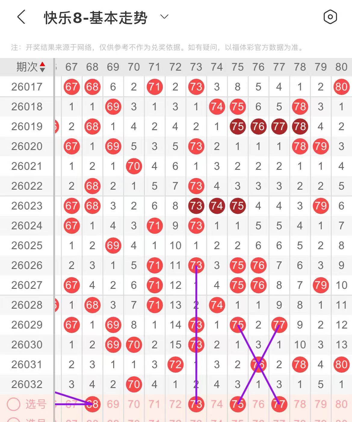 71-80区:本区间上期断区了,从号码走势图上看,上次断区直接回补了三个号码,本期回补个数应该不会太少,出号个数应该在两三个号码左右。有出号走势的号码有73号,上下对称出号走势,75.77号,交叉斜连出号走势。